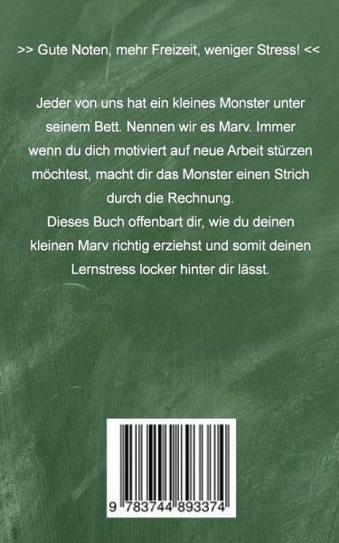 Gute Noten, mehr Freizeit, weniger Stress!Niemand von uns kommt alleine auf die Welt. Immer wenn ein neues Kind geboren wird, erwacht auch ein anderes Wesen zum Leben. Vom ersten bis zum letzten Tag weicht es nicht mehr von deiner Seite und folgt jedem deiner Schritte. Am Anfang unseres Lebens ist er unser Freund und wir haben viel Spaß zusammen. Irgendwann aber beginnt uns das Leben aufzuwecken. Es besteht nicht mehr nur aus unserem gewohnten Tagesablauf, sondern wird ergänzt mit Arbeit, Stress und lernen. Das gefällt dem Wesen aber gar nicht. Warum sollte es auch? Was ist gegen schlafen, essen und spielen einzuwenden? Tja, ohne Fleiß und Erfolg ist es heutzutage kaum möglich, sein Leben nach seinen Regeln zu führen. Wir beginnen zu lernen und zu schuften. Machen Überstunden oder schieben eine Nachtschicht fürs Lernen ein, um die Prüfung am nächsten Tag auch ja zu bestehen! Einer kommt dabei aber viel zu kurz. Das Wesen unter deinem Bett. Anfangs lässt es sich noch viel gefallen, doch dann entwickelt es einen immer größeren Groll gegen alles und stellt sich vor alle wichtigen Dinge im Leben. Wir werden erwachsen, doch das Wesen bleibt immer im Herzen ein Kind. Durch all den Zorn und Groll entwickelt sich das einst so süße Wesen aus Kindertagen zu einem kleinen frechen Monster, dass dir durch alle deine Pläne einen Strich durch die Rechnung macht. "Lernen? Wozu, wenn auf Netflix gerade eine neue Staffel deiner Lieblingsserie läuft?" Das einst so süße Wesen ist zu einem unaufhaltsamen Monster geworden. Glaubt es zumindest ... Jeder von uns hat ein solches Monster.Nennen wir es Marv. Es ist etwas pummlig, hat 2 große, runde Glubschaugen, grünlich zerzaustes Fell und wenn man genau hinschaut, entdeckt man 2 kleine Hörner auf seinem Kopf. Etwa die Hörner des Teufels? Wer weiß ...Auch du besitzt ein kleines Monster unter deinem Bett, welches reichlich Schabernack im Kopf hat.In diesem Buch möchte ich dir auf eine lustige & informative Art & Weise zeigen, wie du deinen kleinen Marv richtig erziehst. Mit über 40 Tipps rund um Produktivität, Gesundheit und Motivation werden deine Noten schnell und auf Dauer verbessert und du bekommst einen ordentlichen Batzen freie Zeit geschenkt. Bist du bereit? Willst du deinem kleinen Marv wirklich weiterhin dabei zusehen, wie es deine Zukunft zerstört? Lass uns gemeinsam deinen Uni- und Schulstress bewältigen und dein Monster richtig erziehen!Worauf wartest du noch? Lass uns loslegen!