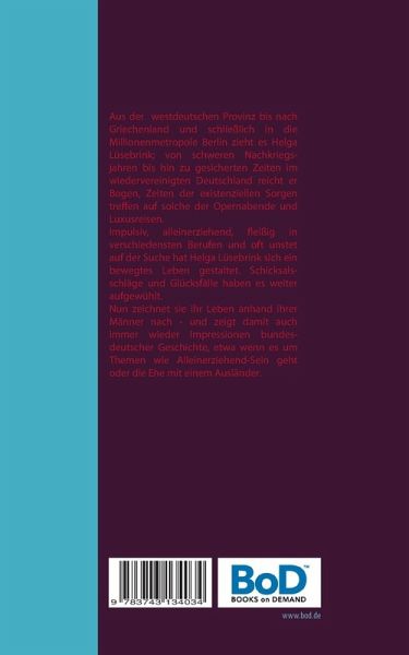Aus der westdeutschen Provinz bis nach Griechenland und schließlich in die Millionenmetropole Berlin zieht es Helga Lüsebrink, von schweren Nachkriegsjahren bis hin zu gesicherten Zeiten im wiedervereinigten Deutschland reicht der Bogen, Zeiten der existentiellen Sorgen treffen auf solche der Opernabende und Luxusreisen. Impulsiv, alleinerziehend, fleißig in verschiedensten Berufen und oft unstet auf der Suche hat Helga Lüsebrink sich ein bewegtes Leben gestaltet. Schicksalsschläge und Glücksfälle haben es weiter aufgewühlt. Nun zeichnet sie ihr Leben anhand ihrer Männer nach - und zeigt damit auch immer wieder Impressionen bundesdeutscher Geschichte etwa wenn es um Themen wie Alleinerziehend-Sein geht oder die Ehe mit einem Ausländer.