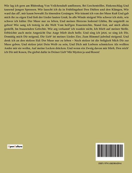 Wie lag ich gern am Blütenhag Von Veilchenduft umflossen, Bei Lerchentriller, Finkenschlag Und tausend jungen Sprossen. Wie lauscht ich da in Frühlingslust Den Düften und den Klängen, Wie ward das all', mir kaum bewußt Zu tönenden Gesängen. Wie träumt ich von der Muse Kuß Und gab mich ihr zu eigen Und ließ der Lieder lauten Gruß, In alle Winde steigen! Wie schwor ich stolz, wie schwor ich kühn: Der Muse nur zu leben, Und meines Herzens lodernd Glühn, Ihr ungeteilt zu geben! Wie sang ich trotzig in die Welt Vom heil'gen Frauenrechte, Stand fest, auf mich allein gestellt, Im brausenden Gefechte. Wie arg verkannt' ich wankte nicht, Ich blieb auf meiner Stelle. Erbleichte auch mein Angesicht Das Auge blieb doch helle. Und sing ich jetzt, so sing ich Dir, Demütig mich Dir neigend, Die Lieb' ist meines Liedes Zier, Zum Himmel jubelnd steigend. Und denk ich an den stolzen Eid: Der Muse nur zu leben ¿ Noch stolzer ist die Seligkeit Mich Dir zur Muse geben. Und stolzer jetzt Dein Weib zu sein, Und Dich mit Lorbern schmücken Als wollten Andre mir sie weihn, Auf meine Locken drücken. Und wenn ein Zweig davon mir blieb, Den reich' ich Dir mit Kosen, Du giebst dafür in Deiner Lieb' Mir Myrten ja und Rosen!