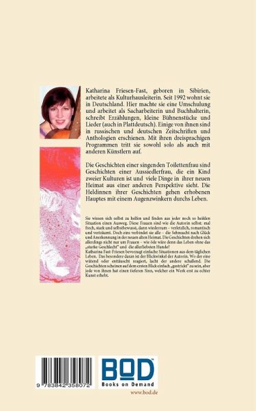 Die Geschichten einer singenden Toilettenfrau sind Geschichten einer Aussiedlerfrau, die ein Kind zweier Kulturen ist und viele Dinge in ihrer neuen Heimat aus einer anderen Perspektive sieht. Die Heldinnen ihrer Geschichten gehen erhobenen Hauptes mit einem Augenzwinkern durchs Leben. Sie wissen sich selbst zu helfen und finden aus jeder noch so heiklen Situation einen Ausweg. Diese Frauen sind wie die Autorin selbst: mal frech, stark und selbstbewusst, dann wiederum - verletzlich, romantisch und verträumt. Doch eins verbindet sie alle - die Sehnsucht nach Glück und Anerkennung in der neuen alten Heimat. Die Geschichten drehen sich allerdings nicht nur um Frauen - wie öde wäre denn das Leben ohne das "starke Geschlecht" und die allerliebsten Hunde?Katharina Fast-Friesen bevorzugt einfache Situationen aus dem täglichen Leben. Das besondere daran ist der Blickwinkel der Autorin. Wo der eine wütend oder enttäuscht reagiert, lacht der andere schallend. Die Geschichten scheinen auf dem ersten Blick einfach "gestrickt" zu sein, aber jede von ihnen hat einen tieferen Sinn, welcher ein Werk erst zu echter Kunst erhebt.