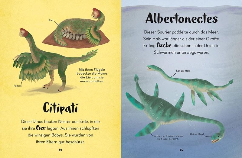 Woran erkennt man den Triceratops? Wo lebten die Dinosaurier? Und mit welchen Tieren von heute sind sie verwandt? Kinder möchten jedes Detail über ihre Lieblingstiere wissen und in diesem besonderen Buch steht alles Wichtige drin. Kurze, liebevoll verfasste Begleittexte vermitteln spannendes Wissen, ohne dabei zu überfordern. So wird zum Beispiel erklart, dass der Brachiosaurus zweimal so hoch wie eine Giraffe war und der Citipati seine Eier ausbrütete, ganz genau wie die Vögel heute.