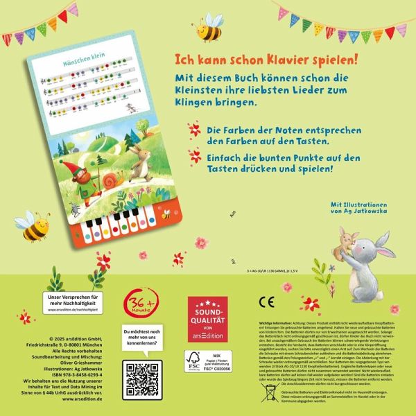 Ton abschaltbar: Mit praktischem An- und AusschalterBatterien auswechselbar: Das Buch enthält handelsübliche Knopfzellenbatterien vom Typ LR 1130 mit je 1,5 V, die sich problemlos auswechseln lassenGeprüfte Qualität: Das Liederbuch unterliegt strengen Sicherheitsanforderungen und regelmäßigen Qualitätskontrollen nach europäischer Spielzeugsicherheitsrichtlinie