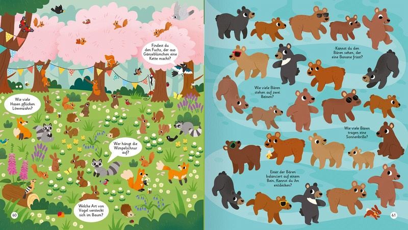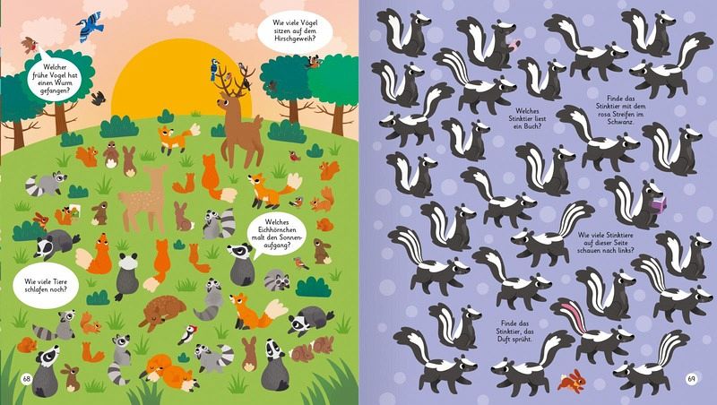 Finde die beiden Streifenhörnchen, die Fangen spielenoder eine Eule mit grünen Augen.Weitere Waldtiere mit Piratenhut oder Brille warten darauf,von dir entdeckt zu werden!