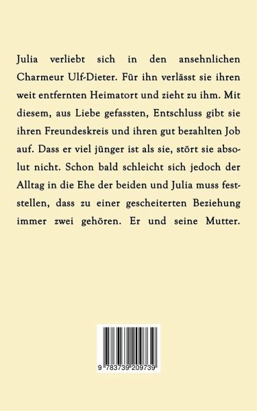 Julia verliebt sich in den ansehnlichen Charmeur Ulf-Dieter. Für ihn verlässt sie ihren weit entfernten Heimatort und zieht zu ihm. Mit diesem, aus Liebe gefassten, Entschluss gibt sie ihren Freundeskreis und ihren gut bezahlten Job auf. Dass er viel jünger ist als sie, stört sie absolut nicht. Nach der Heirat schleicht sich bald der Alltag in die Ehe und Julia lernt erst jetzt den wahren Charakter Ulf-Dieters kennen. Julia will ihre Ehe zwar retten, zweifelt jedoch immer öfter an ihrer Liebe zu ihm und muss feststellen, dass zu einer gescheiterten Beziehung immer zwei gehören. Er und seine Mutter.
