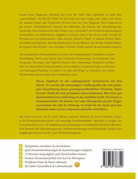 Die medizinische Dokumentation ist einer der bedeutsamsten Eckpfeiler in deiner Behandlung. Schon nach kurzer Zeit verblassen Erinnerungen an Symptome oder Ereignisse. Deswegen sind tägliche Notizen über notwendige Parameter unerlässlich. Nur durch diese Gedankenstützen ist es möglich, Zusammenhänge zu erkennen und konsequent Schlüsse zu ziehen. Um dann die Dinge zu verändern, die ursächlich für deine Beschwerden oder Krankheiten sind. Dieses Tagebuch ist das umfangreichste Sammelwerk auf dem Markt. Es vereint alle notwendigen Einflussgrößen für eine gelungene Einschätzung deiner gesamtgesundheitlichen Situation. Dabei ist jeder Punkt für sich genommen schon bedeutsam. Mit seiner gut durchstrukturierten Aufteilung ist das Ausfüllen leicht. Du kannst in Zusammenarbeit mit deinem Arzt oder Therapeuten gezielt Trigger ausschalten. Ihr seht die Wirkung. So könnt ihr die Suche nach den Ursachen immer weiter eingrenzen und alles wird klarer. Erfassbare Parameter: Allgemeines: Datum, Wochentag, Zyklustag für Frauen, Außentemperatur min. und max., Wetter (sonnig, leicht bewölkt, wolkig, neblig, schwül, Regen, Schnee, Gewitter), Körpergewicht in kg, Körpertemperatur (Fruchtbarkeitstage), Wassertrinken in 200 ml Einheiten Schlaf: Ein-, Durchschlafstörungen, Schlafintervalle (Zeit von bis), Gesamtschlaf in Stunden und Minuten, nächtliche Symptome, nächtliche Toilettengänge, Nachtschweiß Skala 0-10 Stuhlgang: Platz für 9x Stuhlgang (im Notfall bis zu 18x), Stuhlformlegende für die richtige Einordnung der Form Messungen: 8x pro Tag verschiedene Messungen möglich (z.B. Gerinnungswert, Blutzuckerwert, bei fieberhaften Erkrankungen mehrmalige Körpertemperaturmessungen, zurückgelegte Distanzen u. a.) Konkrete Schmerzerfassung: Ort (Or) mit grafischer Darstellung eines Körpers (Vorder-, Rückansicht), Qualität (Qu) mit Legende für Schmerzqualität, Stärke (St) auf Skala von 0 bis 10 Stresslevel und Stimmung: (3x am Tag möglich): körperlich, emotional, allgemeine Stimmung, allgemeines Schmerzempfinden Notizen und Dankbarkeit Ernährung: wann, welche Lebensmittel und Getränke Aktivitäten: Bewegung, Sport, Ausflüge, Reize u. a. (wann, Dauer) Symptome: welche, wann, Dauer Tabelle direktes Tracken gewünschter Parameter Auswertungen: wöchentlich, diverse Auswertungen (Lebensmittel, Aktivitäten, Gedanken, Gefühltes, Erreichtes, Selbstliebe, Notizen, Umfeldbedingungen, positive/negative Vorkommnisse in menschlichen Beziehungen u.a.)