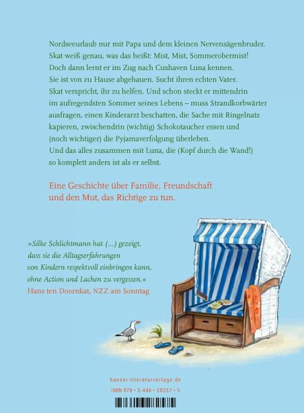 Silke Schlichtmanns warmherziges Sommerabenteuer über Familie, Vertrauen und Mut. Die draufgängerische Luna und der grübelnde Skat - ein ungleiches Team, das immer zusammenhältSo hat Skat sich seine Ferien nicht vorgestellt: Erst ist sein bester Freund Jeppe wie vom Erdboden verschluckt. Dann hat Papa diese bescheuerte Idee mit dem Kitesurfkurs. Und schließlich geht's auch noch ohne Mama in den Nordseeurlaub. Mist, Mist, Sommerobermist! Bis Skat im Zug nach Cuxhaven Luna kennenlernt. Sie ist von zu Hause abgehauen. Sucht ihren echten Vater. Skat verspricht, ihr zu helfen. Und schon steckt er mittendrin im aufregendsten Sommer seines Lebens - muss seinen Vater anschwindeln und den Kitesurfkurs schwänzen (richtig schwer), Strandkorbwärter ausfragen und die Sache mit Ringelnatz kapieren (ziemlich gut) und immer wieder Luna bremsen, die oft mit dem Kopf durch die Wand will. Eine Geschichte über Familie und Freundschaft, Lüge und Vertrauen, Wut und Mut, spannend, witzig und herzerwärmend erzählt.