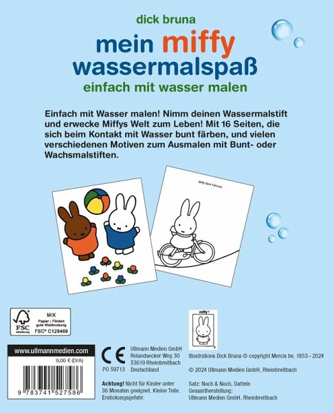 Einfach mit Wasser malen! Nimm deinen Wassermalstift und erwecke Miffys Welt zum Leben! Mit 16 Seiten, die sich beim Kontakt mit Wasser bunt färben und vielen verschiedenen Motiven zum Ausmalen mit Bunt -oder Wachsmalstiften.In diesem Wassermalbuch sind typische Miffy-Szenen enthalten: Miffy fährt Fahrrad, schaukelt oder spielt mit Hund Snuffy oder ihren Freunden. Die Wassermalseiten färben sich beim Kontakt mit Wasser und können immer wieder bemalt werden.Entdecke die liebevollen Illustrationen mit Miffy und ihren Freunden. Wasser-Ausmalspaß mit Überraschungs-Effekt!