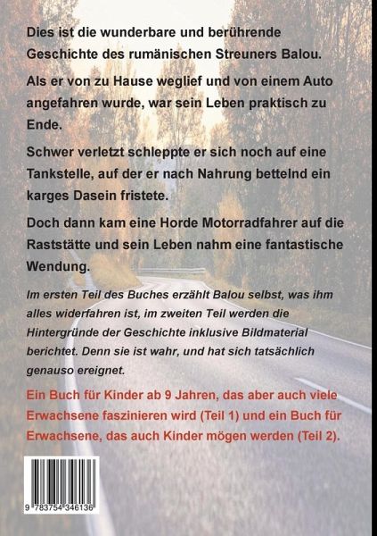 Dies ist die wunderbare und berührende Geschichte des rumänischen Streuners Balou.Als er von zu Hause weglief und von einem Auto angefahren wurde, war sein Leben praktisch zu Ende. Schwer verletzt mit zwei gebrochenen Beinen schleppte er sich noch auf eine Tankstelle, auf der er nach Nahrung bettelnd ein karges Dasein fristete.Doch dann kam eine Horde Motorradfahrer auf die Raststätte und sein Leben nahm eine fantastische Wendung.Das Buch besteht aus zwei Büchern in einem.Im ersten Teil des Buches erzählt Balou selbst, was ihm alles widerfahren ist, im zweiten Teil werden die Hintergründe der Geschichte inklusive Bildmaterial berichtet. Denn sie ist wahr, und hat sich tatsächlich genauso ereignet.Teil 1 für Kinder ab 9 Jahren (auch zum selbstlesen), der aber auch viele Erwachsene faszinieren wird und Teil 2 für Erwachsene, den sicher auch Kinder mögen werden.