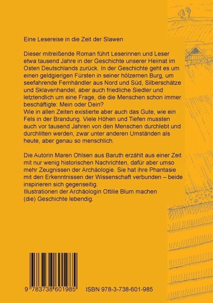 Eine Lesereise in die Zeit der SlawenDieser mitreißende Roman führt Leserinnen und Leser etwa tausend Jahre in der Geschichte unserer Heimat im Osten Deutschlands zurück. In der Geschichte geht es um einen geldgierigen Fürsten in seiner hölzernen Burg, um seefahrende Fernhändler aus Nord und Süd, Silberschätze und Sklavenhandel, aber auch friedliche Siedler und letztendlich um eine Frage, die die Menschen schon immer beschäftigte: Mein oder Dein? Wie in allen Zeiten existierte aber auch das Gute, wie ein Fels in der Brandung. Viele Höhen und Tiefen mussten auch vor tausend Jahren von den Menschen durchlebt und durchlitten werden, zwar unter anderen Umständen als heute, aber genau so menschlich.Die Autorin Maren Ohlsen aus Baruth erzählt aus einer Zeit mit nur wenig historischen Nachrichten, dafür aber umso mehr Zeugnissen der Archäologie. Sie hat ihre Phantasie mit den Erkenntnissen der Wissenschaft verbunden - beide inspirieren sich gegenseitig. Illustrationen der Archäologin Ottilie Blum machen (die) Geschichte lebendig.