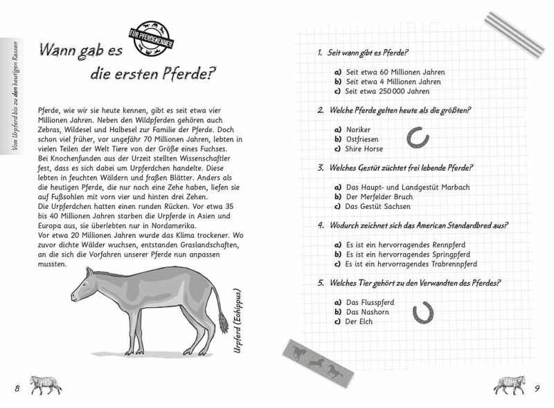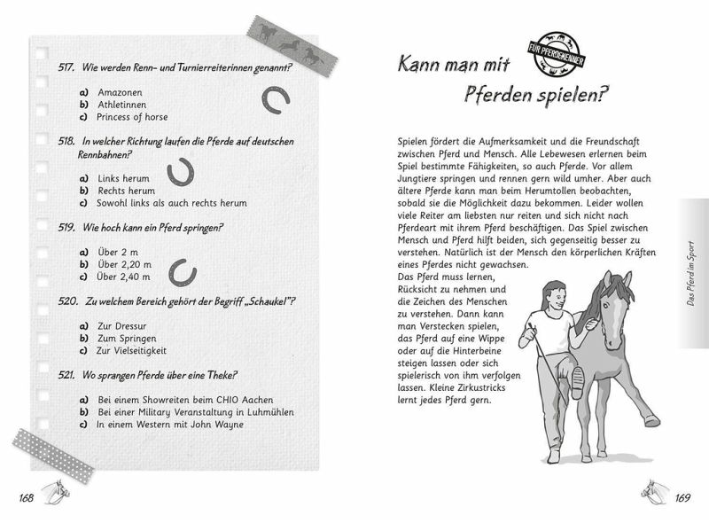 Das ultimative Quiz-Buch für Pferdefans. Können Pferde rülpsen und warum sind Pferdeäpfel rund? Mit mal witzigen, mal verrückten, aber immer spannenden Fragen können Pferdefans hier ihr Wissen testen. Neben dem Quiz gibt es umfangreiche Info-Texte über Pferderassen, Anatomie, Verhalten, Reiten und Pferde im Profi-Sport. Und wer die Auflösung der Quizfragen sucht, schlägt einfach am Ende des Buches nach.