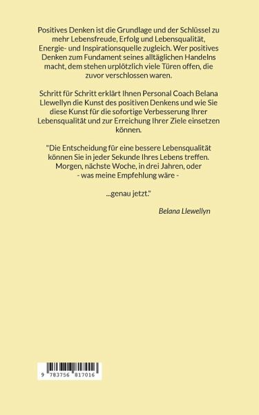 Positives Denken ist die Grundlage und der Schlüssel zu mehr Lebensfreude, Erfolg und Lebensqualität, Energie- und Inspirationsquelle zugleich. Wer positives Denken zum Fundament seines alltäglichen Handelns macht, dem stehen urplötzlich viele Türen offen, die zuvor verschlossen waren.Schritt für Schritt erklärt Ihnen Personal Coach Belana Llewellyn die Kunst des positiven Denkens und wie Sie diese Kunst für die sofortige Verbesserung Ihrer Lebensqualität und zur Erreichung Ihrer Ziele einsetzen können:- Ablegen einer Opfer-Mentalität- Selbstreflexion- Potentiale entdecken und nutzen- Ziele ins Auge fassen und erreichen- Die Bedeutung unserer Alltags-Kommunikation für unser Mindset- Resilienz entwickeln"Die Entscheidung für eine bessere Lebensqualität können Sie in jeder Sekunde Ihres Lebens treffen. Morgen, nächste Woche, in drei Jahren, oder - was meine Empfehlung wäre - ...genau jetzt."Belana Llewellyn