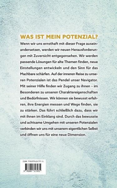 Was ist mein Potenzial? Wenn wir uns ernsthaft mit dieser Frage auseinandersetzen, werden wir neuen Herausforderungen mit Zuversicht entgegensehen. Wir werden passende Lösungen für alte Themen finden, neue Einstellungen entwickeln und den Sinn für das Machbare schärfen. Auf der inneren Reise zu unseren Potenzialen ist das Pendel unser Navigator. Mit seiner Hilfe finden wir Zugang zu ihnen - im Besonderen zu unseren Charaktereigenschaften und Bedürfnissen. Wir können sie bewusst erfahren, ihre Energien messen und Wege finden, sie zu stärken. Das führt schließlich dazu, dass wir mit ihnen im Einklang sind. Durch das bewusste und achtsame Umgehen mit unseren Potenzialen verbinden wir uns mit unserem eigentlichen Selbst und öffnen uns für eine neue Dimension.