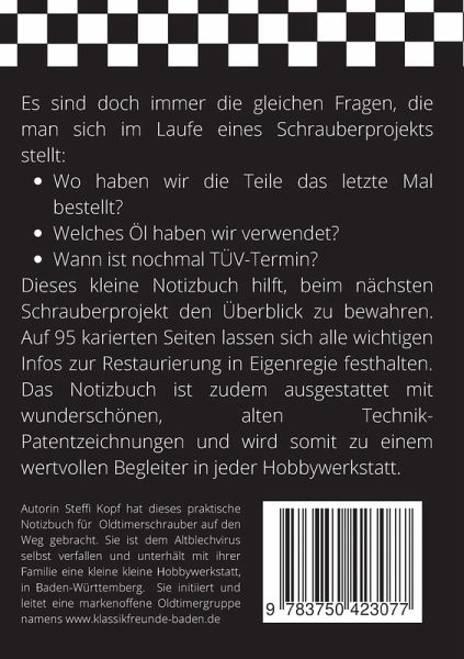 Dieses Notizbuch ist ein echter Helfer bei jeder Oldtimerrestaurierung: Darin können alle Handgriffe zum Projekt festgehalten werden.Trage beispielsweise einfach ein, welche Ersatzteile Du bestellen willst, wann Du einen Ölwechsel gemacht hast und was es alles zu tun gibt. Auf dezent karierten Seiten ist viel Platz für die wertvolle Dokumentation Deines Restaurierungsprojekts. Das Notizbuch ist zudem ausgestattet mit historischen, technischen Patentzeichnungen und hilfreichen Tipps und Tricks aus der Oldtimerwerkstatt. Praktische Geschenkidee für alle, die gerne an klassischen Fahrzeugen schrauben.