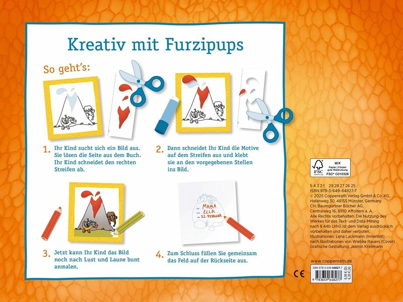 16 Motive zum Schneiden, Kleben und Malen - so geht's: 1. Eine Seite aus dem Buch lösen und den rechten Streifen abtrennen. 2. Die Motive auf dem Streifen ausschneiden und an den vorgegebenen Stellen ins Bild kleben. 3. Den Rest nach Lust und Laune kunterbunt ausmalen. 4. Zum Schluss das Feld auf der Rückseite ausfüllen. Schneidenlernen leicht gemacht!