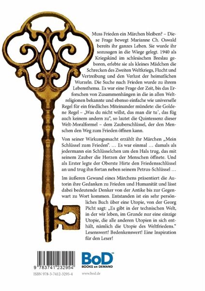Muss Frieden ein Märchen bleiben? - Diese Frage bewegt Marianne Ch. Oswald bereits ihr ganzes Leben. Sie wurde ihr sozusagen in die Wiege gelegt. 1940 als Kriegskind im schlesischen Breslau geboren, erlebte sie als kleines Mädchen die Schrecken des Zweiten Weltkriegs, Flucht und Vertreibung und den Verlust der heimatlichen Wurzeln. Die Suche nach Frieden wurde zu ihrem Lebensthema. Es war eine Frage der Zeit, bis das Erforschen von Zusammenhängen in die in allen Weltreligionen bekannte und ebenso einfache wie universelle Regel für ein friedliches Miteinander mündete: die Goldene Regel - "Was du nicht willst, das man dir tu , das füg auch keinem andern zu", so lautet die Quintessenz dieser Welt-Moralformel - dem Zauberschlüssel, der den Menschen den Weg zum Frieden öffnen kann. Von seiner Wirkungsmacht erzählt ihr Märchen "Mein Schlüssel zum Frieden". ... Es war einmal ... damals als jedermann ein Schlüsselchen um den Hals trug, das mit seinem Zauber die Herzen der Menschen öffnete. Und als Erster legte der Oberste Hirte den Friedensschlüssel an und trug ihn fortan neben seinem Petrus-Schlüssel ... Im äußeren Gewand eines Märchens präsentiert die Autorin ihre Gedanken zu Frieden und Humanität und lässt dabei bedeutende Denker von der Antike bis zur Gegenwart zu Wort kommen. Entstanden ist ein sehr persönliches Buch über eine Utopie, von der Georg Picht sagt: "Es gibt in der technischen Welt, in der wir leben, im Grunde nur eine einzige Utopie, die alle anderen Utopien in sich enthält, nämlich die Utopie des Weltfriedens." Lesenswert! Bedenkenswert! Eine Inspiration für den Leser!