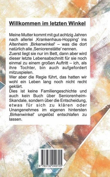 Meine Mutter kommt nach allerlei 'Krankenhaus-Hopping' mit gut achtzig Jahren ins Altenheim 'Birkenwinkel'- was sie dort natürlich 'Seniorenstätte' nennen.Zuerst liegt sie nur im Bett, aber dann wird dieser letzte Lebensabschnitt für sie noch einmal zu einem großen Auftritt - ich als ihre Tochter bin auch aufgefordert mitzuspielen! Wer aber die Regie führen soll, das haben wir ein Leben lang nicht recht geklärt ...Es ist keine Familiengeschichte und auch kein Buch über Seniorenheim-Skandale, sondern über die Entscheidung, für sich etwas zu klären oder Unangenehmes im eigenen hintersten 'Birkenwinkel' ungelöst einschlafen zu lassen.