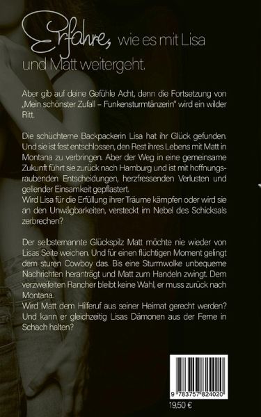Erfahre, wie es mit Lisa und Matt weitergeht. Aber gib auf deine Gefühle Acht, denn die Fortsetzung von "Mein schönster Zufall - Funkensturmtänzerin" wird ein wilder Ritt.Mein schönster Zufall TaschenherzkämpferinDie schüchterne Backpackerin Lisa hat ihr Glück gefunden. Und sie ist fest entschlossen, den Rest ihres Lebens mit Matt in Montana zu verbringen. Aber der Weg in eine gemeinsame Zukunft führt sie zurück nach Hamburg und ist mit hoffnungsraubenden Entscheidungen, herzfressenden Verlusten und gellender Einsamkeit gepflastert. Wird Lisa für die Erfüllung ihrer Träume kämpfen oder wird sie an den Unwägbarkeiten, versteckt im Nebel des Schicksals zerbrechen?Der selbsternannte Glückspilz Matt möchte nie wieder von Lisas Seite weichen. Und für einen flüchtigen Moment gelingt dem sturen Cowboy das. Bis eine Sturmwolke unbequeme Nachrichten heranträgt und Matt zum Handeln zwingt. Dem verzweifelten Rancher bleibt keine Wahl, er muss zurück nach Montana.Wird Matt dem Hilferuf aus seiner Heimat gerecht werden? Und kann er gleichzeitig Lisas Dämonen aus der Ferne in Schach halten?Ein mitreißender Liebesroman für heiße Stunden.