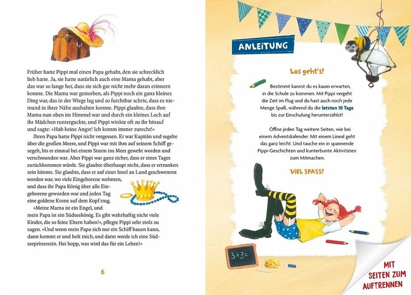 Ein Adventskalenderformat für den Sommer! Pippi begleitet angehende Schulkinder vor der Einschulung, macht ihnen Mut und stärkt die Vorfreude auf den großen Tag. Jeden Tag dürfen weitere Seiten geöffnet werden. Dahinter verbergen sich quirlige Pippi-Geschichten zum Vorlesen, begleitet von ideal auf den Schuleinstieg abgestimmten, lustigen Aktivitäten, Pausenbrot-Ideen, Spieletipps für den Schulhof und mehr.