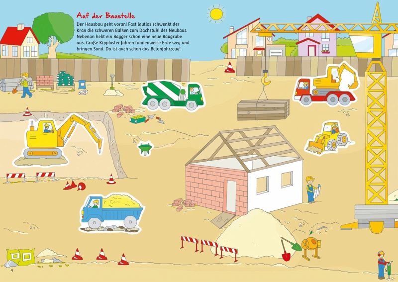 Auf dem Bauernhof ist Erntezeit und auf den Feldern brummen schwere Maschinen. Rund um den Bahnhof fahren Straßenbahn, Linienbusse und Taxen. Und bei der Rallye in der Wüste graben sich schwere Monstertracks und Jeeps durch den Sand. Die bunten Szenen laden Kinder ab 6 Jahren ein, die Seitenmit fast 300 Stickern selbst zu gestalten. Denn Bagger und Kipplader, Abschleppwagen und Oldtimer, Jumbojet und Passagierflieger dürfen sie selbst aufkleben. Kurze begleitende Texte geben dabei wichtige Hinweise. Eine tolle Beschäftigung für unterwegs oder während längerer Wartzeiten.