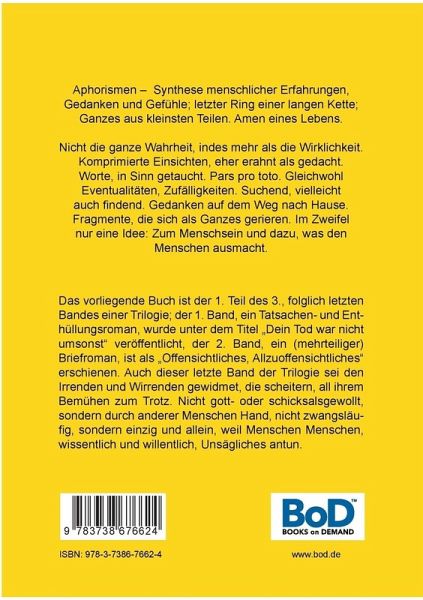 Aphorismen - Synthese menschlicher Erfahrungen, Gedanken und Gefühle; letzter Ring einer langen Kette; Ganzes aus kleinsten Teilen. Amen eines Lebens.Nicht die ganze Wahrheit, indes mehr als die Wirklichkeit. Komprimierte Einsichten, eher erahnt als gedacht. Worte, in Sinn getaucht. Pars pro toto. Gleichwohl Eventualitäten, Zufälligkeiten. Suchend, vielleicht auch findend. Gedanken auf dem Weg nach Hause. Fragmente, die sich als Ganzes gerieren. Im Zweifel nur eine Idee: Zum Menschsein und dazu, was den Menschen ausmacht.Das vorliegende Buch ist der 1. Teil des 3., folglich letzten Bandes einer Trilogie; der 1. Band, ein Tatsachen- und Enthüllungsroman, wurde unter dem Titel "Dein Tod war nicht umsonst" veröffentlicht, der 2. Band, ein (mehrteiliger) Briefroman, ist als "Offensichtliches, Allzuoffensichtliches" erschienen. Auch dieser letzte Band der Trilogie sei den Irrenden und Wirrenden gewidmet, die scheitern, all ihrem Bemühen zum Trotz. Nicht gott- oder schicksalsgewollt,sondern durch anderer Menschen Hand, nicht zwangsläufig, sondern einzig und allein, weil Menschen Menschen, wissentlich und willentlich, Unsägliches antun.