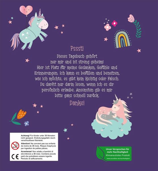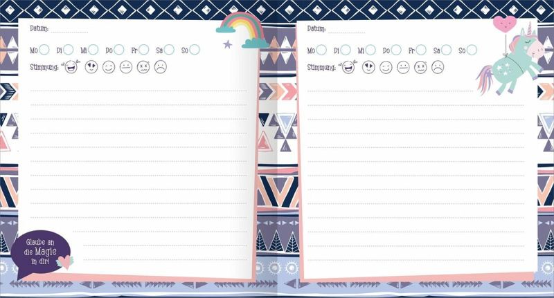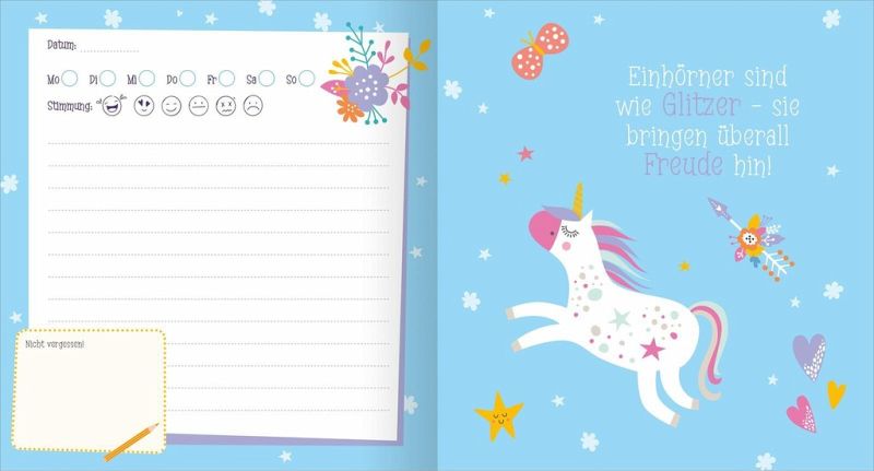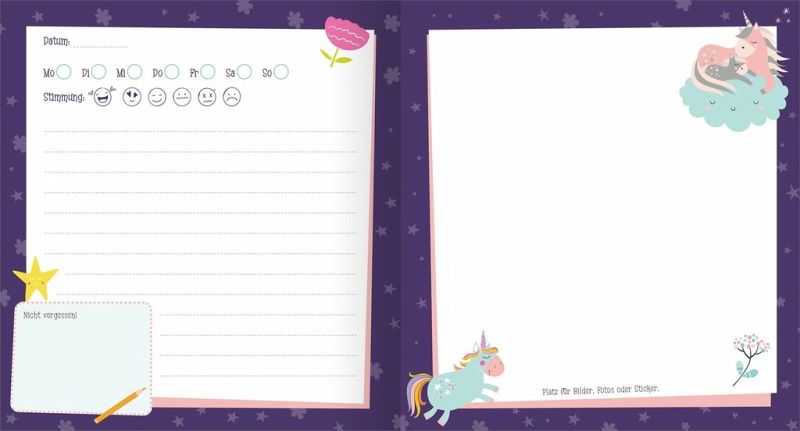Das Tagebuch ist mit Einhörnern, Feen und niedlichen Tieren zauberhaft bunt gestaltet. Die Seiten sind entweder liniert oder blanko und bieten viel Platz, sich kreativ auszutoben und Erinnerungen in Bildern und Worten darin festzuhalten.