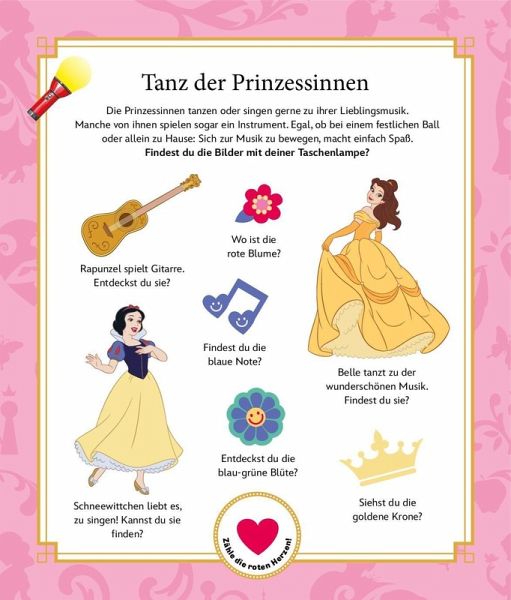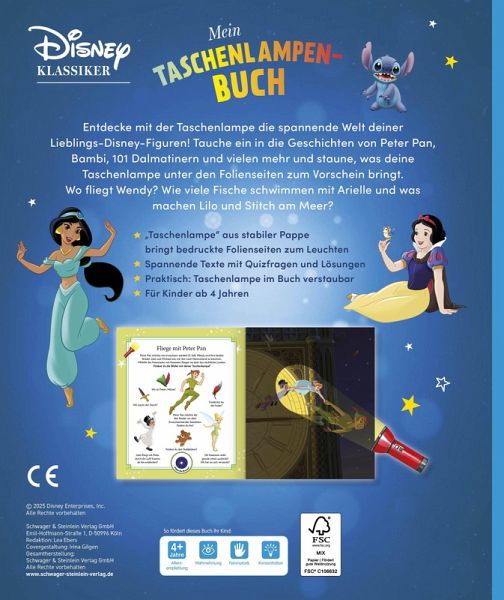 Auf jeder zweiten Seite im Buch gibt es kleine Texte und tolle Suchaufgaben, die mit Hilfe der Papp-Taschenlampe auf den Bild-Seiten gelöst werden können. So macht das Suchen und Entdecken auf den Folienseiten besonders viel Spaß! Wo ist Bambis Freund Klopfer? Entdeckst du die Muscheln von Arielle? Wo haben sich die Dalmatiner versteckt und wie viele Sterne zählst du bei Peter Pan? Ein spannendes Quiz am Ende testet zusätzlich dein Wissen über deine Lieblings-Disney-Figuren.