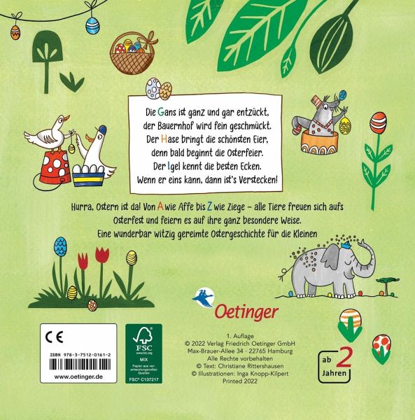 Spielerisches Lernen: Vermittelt das ABC auf eine unterhaltsame und einprägsame Weise durch witzig gereimte Geschichten. Farbenfrohe und frische Illustrationen: Der Illustrationsstil von Inga Knopp-Kilpert bringt eine fröhliche und frühlingshafte Optik ins Kinderzimmer. Förderung der Sprachentwicklung: Die Reime unterstützen nicht nur das Erlernen des Alphabets, sondern auch die Sprachfähigkeiten der Kinder. Ideal für das Osternest: Ein perfektes Geschenk, das Kinder im Vorfeld der Osterfeiertage begeistert.