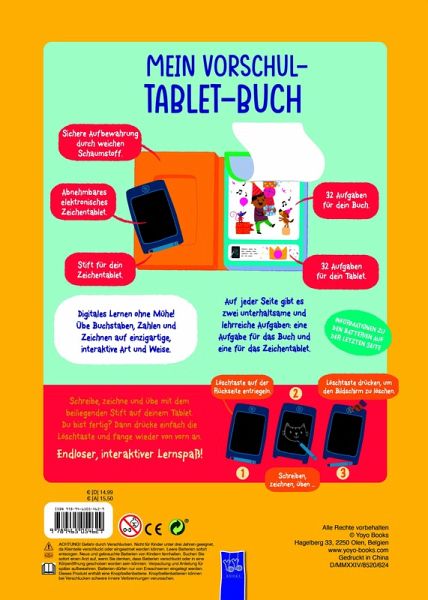 So gelingt das Lernen von erstem Schreiben und erstem Rechnen ohne Mühe. Diese wichtigen Vorschul-Fähigkeiten können mit diesem Buch auf einzigartige und vor allem interaktive Art und Weise geübt werden. Auf jeder Seite gibt es zwei unterhaltsame und lehrreiche Aufgaben: eine Aufgabe für das Buch und eine für das Zeichen Tablet. Mit dem beiliegenden Stift können die Aufgaben auf dem Tablet umgesetzt werden. Fertig? Einfach auf die Löschtaste drücken und wieder von vorne anfangen.
