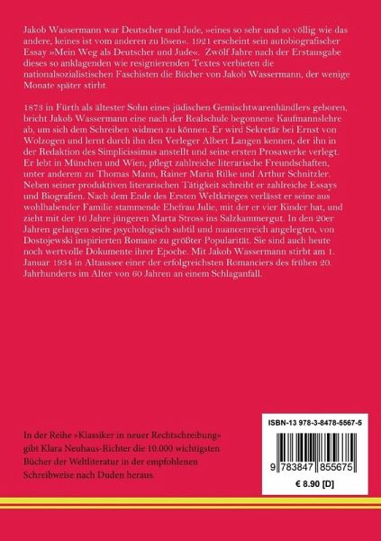 In der Reihe »Klassiker in neuer Rechtschreibung« gibt Klara Neuhaus-Richter die wichtigsten Bücher der Weltliteratur in der empfohlenen Schreibweise nach Duden heraus. Jakob Wassermann: Mein Weg als Deutscher und Jude. Eine Autobiografie Jakob Wassermann war Deutscher und Jude, »eines so sehr und so völlig wie das andere, keines ist vom anderen zu lösen«. 1921 erscheint sein autobiografischer Essay »Mein Weg als Deutscher und Jude«. Zwölf Jahre nach der Erstausgabe dieses so anklagenden wie resignierenden Textes verbieten die nationalsozialistischen Faschisten die Bücher von Jakob Wassermann, der wenige Monate später stirbt. Erstausgabe: Berlin, S. Fischer Verlag, 1921 mit der Widmung: »Ferruccio Busoni - dem Freund dem Künstler gewidmet«. Textgrundlage ist die Ausgabe: Deutscher Taschenbuch Verlag, München, 1994. Neu herausgegeben und mit einer Biografie des Autors versehen von Klara Neuhaus-Richter, Berlin 2023. Umschlaggestaltung von Rainer Richter unter Verwendung einer Porträtzeichnung von Josefine Weinschrott. Gesetzt aus der Minion Pro, 11 pt. Henricus - Edition Deutsche Klassik GmbH Über den Autor: 1873 in Fürth als ältester Sohn eines jüdischen Gemischtwarenhändlers geboren, bricht Jakob Wassermann eine nach der Realschule begonnene Kaufmannslehre ab, um sich dem Schreiben widmen zu können. Er wird Sekretär bei Ernst von Wolzogen und lernt durch ihn den Verleger Albert Langen kennen, der ihn in der Redaktion des Simplicissimus anstellt und seine ersten Prosawerke verlegt. Er lebt in München und Wien, pflegt zahlreiche literarische Freundschaften, unter anderem zu Thomas Mann, Rainer Maria Rilke und Arthur Schnitzler. Neben seiner produktiven literarischen Tätigkeit schreibt er zahlreiche Essays und Biografien. Nach dem Ende des Ersten Weltkrieges verlässt er seine aus wohlhabender Familie stammende Ehefrau Julie, mit der er vier Kinder hat, und zieht mit der 16 Jahre jüngeren Marta Stross ins Salzkammergut. In den 20er Jahren gelangen seine psychologisch subtil und nuancenreich angelegten, von Dostojewski inspirierten Romane zu größter Popularität. Sie sind auch heute noch wertvolle Dokumente ihrer Epoche. Mit Jakob Wassermann stirbt am 1. Januar 1934 in Altaussee einer der erfolgreichsten Romanciers des frühen 20. Jahrhunderts im Alter von 60 Jahren an einem Schlaganfall.