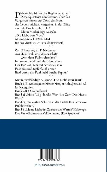 Philosophie ist nur der Beginn zu atmen.Diese Spur trägt den Gewinn, über dasVergessen hinaus das Grün, den Kerndes Lebens nicht zu vergessen, in der Blüteauch als Frucht zu bestehn!Meine vierbändige Ausgabe"Die Liebe zum Wort"ist ein kleines DENK- MALfür das Wort: so, ich, ein kleiner Poet!___Zur Erinnerung an F. Nietzsche:Aus "Die Fröhliche Wissenschaft""Mit dem Fuße schreiben"Ich schreib nicht mit der Hand alleinDer Fuß will stets mit Schreiber sein.Fest, frei und tapfer läuft er mirBald durch das Feld, bald durchs Papier."___Meine vierbändige Ausgabe "Die Liebe zum Wort"Buch 1 Einzelausgabe: Meine Morgenröthe/Jenseits Aller Kategorien.Buch 2,3,4 Sammelband.Band 2 "Mein Weg durchs Wort der Zeit/ Die Maske Wort/"Band 3 "Die ersten Schritte in das Licht/ Das Schwarze Eichhörnchen."Band 4 "Meine Liebe im Zeichen des Wortes/ Holzwege:Das Unvollkommene Vollkommene (Die Sprache)"