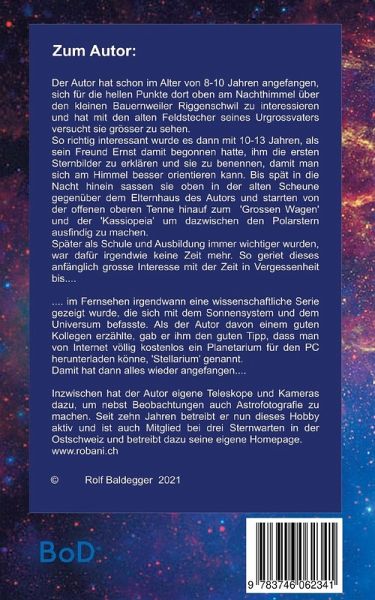 Der Autor hat schon im Alter von 8 bis 10 Jahren angefangen, sich für die vielen hellen Punkte dort oben am Nachthimmel über dem kleinen Bauernweiler Riggenschwil zu interessieren und hat mit dem alten Feldstecher seines Urgrossvaters versucht sie grösser zu sehen. So richtig interessant wurde es dann mit 10 bis 12 Jahren, als sein Freund Ernst damit begonnen hatte, ihm die ersten Sternbilder zu erklären und sie zu benennen, damit man sich am Himmel besser orientieren kann. Bis spät in die Nacht hinein sassen sie oben in der alten Scheune gegenüber dem Elternhaus des Autors und starrten von der offenen oberen Tenne hinauf zum 'Grossen Wagen' und der 'Kassiopeia', um dazwischen den Polarstern ausfindig zu machen. Später als Schule und Ausbildung immer wichtiger wurden, war dafür irgendwie keine Zeit mehr. So geriet dieses anfänglich grosse Interesse mit den Jahren in Vergessenheit bis.... .... im Fernsehen irgendwann eine wissenschaftliche Serie gezeigt wurde, die sich mit dem Sonnensystem und dem Universum befasste. Als der Autor davon einem Freund erzählte, gab er ihm den guten Tipp, dass man vom Internet völlig kostenlos ein Planetarium für den PC herunterladen könne, 'Stellarium' genannt. Damit hat dann alles wieder angefangen. Inzwischen hat der Autor eigene Teleskope und Kameras dazu, um nebst Beobachtungen auch Astrofotografie zu machen. Seit zehn Jahren betreibt er nun dieses Hobby aktiv und ist auch Mitglied bei drei Sternwarten in der Ostschweiz und präsentiert seine Arbeiten auf seiner eigenen Homepage. www.robani.ch
