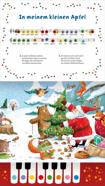 Mit diesem Klavierbuch können schon die Kleinsten ihre liebsten Weihnachtslieder selbst zum Klingen bringen. Auf zehn wunderschön illustrierten Doppelseiten finden sich Notensätze und Liedtexte für beliebte Weihnachtslieder wie "Schneeflöckchen, Weißröckchen", "Jingle Bells" und "O du fröhliche".