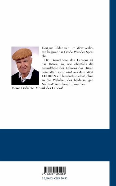 Dort, wo Bilder sich im Wort verlieren beginnt das Große Wunder Sprache!Die Grundthese des Lernens ist das Hören, so, wie ebenfalls die Grundthese des Lehrens das Hören beinhaltet; sonst wird aus dem Wort LEHREN ein leerendes Selbst, ohne an die Wahrheit des beiderseitigen Nicht-Wissens heranzukommen. Meine Gedichte: Mosaik des Lebens!