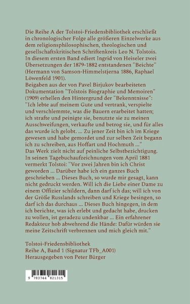 Die Reihe A der Tolstoi-Friedensbibliothek erschließt in chronologischer Folge alle größeren Einzelwerke aus dem religionsphilosophischen, theologischen und gesellschaftskritischen Schriftenkreis Leo N. Tolstois. In diesem ersten Band ediert Ingrid von Heiseler zwei Übersetzungen der 1879-1882 entstandenen "Beichte" (Hermann von Samson-Himmelstjerna 1886, Raphael Löwenfeld 1901).Beigaben aus der von Pavel Birjukov bearbeiteten Dokumentation "Tolstois Biographie und Memoiren" (1909) erhellen den Hintergrund der "Bekenntnisse": "Ich lebte auf meinem Gute und vertrank, verspielte und…mehr