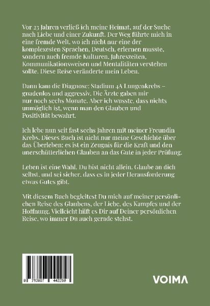 Vor 23 Jahren verließ ich meine Heimat, auf der Suche nach Liebe und einer Zukunft. Der Weg führte mich in eine fremde Welt, wo ich nicht nur eine der komplexesten Sprachen, Deutsch, erlernen musste, sondern auch fremde Kulturen, Jahreszeiten, Kommunikationsweisen und Mentalitäten verstehen sollte. Diese Reise veränderte mein Leben.Dann kam die Diagnose: Stadium 4A Lungenkrebs - gnadenlos und aggressiv. Die Ärzte gaben mir nur noch sechs Monate. Aber ich wusste, dass nichts unmöglich ist, wenn man den Glauben und Positivität bewahrt.Ich lebe nun seit fast sechs Jahren mit meiner Freundin Krebs. Dieses Buch ist nicht nur meine Geschichte über das Überleben; es ist ein Zeugnis für die Kraft und den unerschütterlichen Glauben an das Gute in jeder Prüfung.Leben ist eine Wahl. Du bist nicht allein. Glaube an dich selbst, und sei sicher, dass es in jeder Herausforderung etwas Gutes gibt.Mit diesem Buch begleitest Du mich auf meiner persönlichen Reise des Glaubens, der Liebe, des Kampfes und der Hoffnung. Vielleicht hilft es Dir auf Deiner persönlichen Reise, wo immer Du auch gerade stehst.