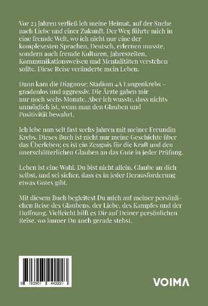 Vor 23 Jahren verließ ich meine Heimat, auf der Suche nach Liebe und einer Zukunft. Der Weg führte mich in eine fremde Welt, wo ich nicht nur eine der komplexesten Sprachen, Deutsch, erlernen musste, sondern auch fremde Kulturen, Jahreszeiten, Kommunikationsweisen und Mentalitäten verstehen sollte. Diese Reise veränderte mein Leben.Dann kam die Diagnose: Stadium 4A Lungenkrebs - gnadenlos und aggressiv. Die Ärzte gaben mir nur noch sechs Monate. Aber ich wusste, dass nichts unmöglich ist, wenn man den Glauben und Positivität bewahrt.Ich lebe nun seit fast sechs Jahren mit meiner Freundin Krebs. Dieses Buch ist nicht nur meine Geschichte über das Überleben; es ist ein Zeugnis für die Kraft und den unerschütterlichen Glauben an das Gute in jeder Prüfung.Leben ist eine Wahl. Du bist nicht allein. Glaube an dich selbst, und sei sicher, dass es in jeder Herausforderung etwas Gutes gibt.Mit diesem Buch begleitest Du mich auf meiner persönlichen Reise des Glaubens, der Liebe, des Kampfes und der Hoffnung. Vielleicht hilft es Dir auf Deiner persönlichen Reise, wo immer Du auch gerade stehst.