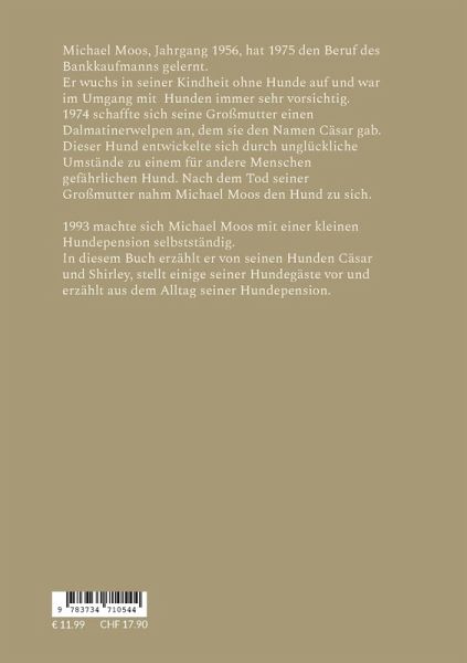 Michael Moos, Jahrgang 1956, hat 1975 den Beruf des Bankkaufmanns gelernt.Er wuchs in seiner Kindheit ohne Hunde auf und war im Umgang mit Hunden immer sehr vorsichtig.1974 schaffte sich seine Großmutter einen Dalmatinerwelpen an, dem sie den Namen Cäsar gab. Dieser Hund entwickelte sich durch unglückliche Umstände zu einem für andere Menschen gefährlichen Hund. Nach dem Tod seiner Großmutter nahm Michael Moos den Hund zu sich.1993 machte sich Michael Moos mit einer kleinen Hundepension selbstständig.In diesem Buch erzählt er von seinen Hunden Cäsar und Shirley, stellt einige seiner Hundegäste vor und erzählt aus dem Alltag seiner Hundepension.