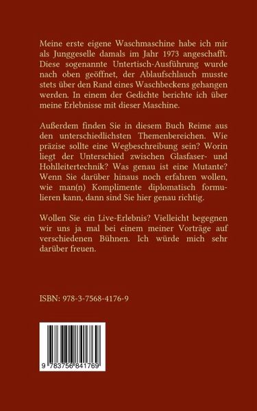 Meine erste eigene Waschmaschine habe ich mir als Junggeselle damals im Jahr 1973 angeschafft. Diese sogenannte Untertisch-Ausführung wurde nach oben geöffnet, der Ablaufschlauch musste stets über den Rand eines Waschbeckens gehangen werden. In einem der Gedichte berichte ich über meine Erlebnisse mit dieser Maschine.Außerdem finden Sie in diesem Buch Reime aus den unterschiedlichsten Themenbereichen. Wie präzise sollte eine Wegbeschreibung sein? Worin liegt der Unterschied zwischen Glasfaser- und Hohlleitertechnik? Was genau ist eine Mutante? Wenn Sie darüber hinaus noch erfahren wollen, wie man(n) Komplimente diplomatisch formulieren kann, dann sind Sie hier genau richtig.