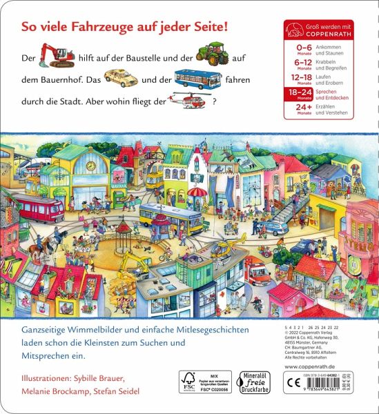 sehen. Sie erste Doppelseite bildet eine Kreuzung ab, Müllabfuhr, Bus, Rohrreinigung und ein…mehrDieses Pappbilderbuch hat ein etwas größeres Format und es gibt auch viel zu sehen. Das Cover zeigt Eltern, die ihren Kinder auf einer Brücke stehend die Umgebung zeigen. Da steht ein Kran mit der dazugehörigen Baustelle, neben der Straße verläuft ein Radweg und auf dem Fluss ist ein Paddelboot zu sehen. Sie erste Doppelseite bildet eine Kreuzung ab, Müllabfuhr, Bus, Rohrreinigung und ein Paketauto sind u.a. zu sehen. Der kleine Text regt zum Mitlesen an, denn einige Worte sind durch Fahrzeuge, die wir auf der Seite sehen ersetzt. Weiter geht es mit einem Bauernhof, da hoppeln Hasen über das abgemähte Feld, es gibt allerlei Fahrzeuge und Tiere zu benennen. So viele Fahrzeuge sind auf der Baustelle zu sehen, da wird das Fundament gegossen und Bauteile abgeladen. Mit der Bahn geht es in den Urlaub und danach ist ein Tankwagen verunglückt und hat ein Haus in Brand gesetzt. Viele Fahrzeuge löschen und retten. Auf der letzten Doppelseite geht es ans Wasser. Die Kinder werden viel Spaß sich die vielen Fahrzeuge anzuschauen und es wird viele Fragen zu beantwortet werden, zu all diesen Wimmelbildern.