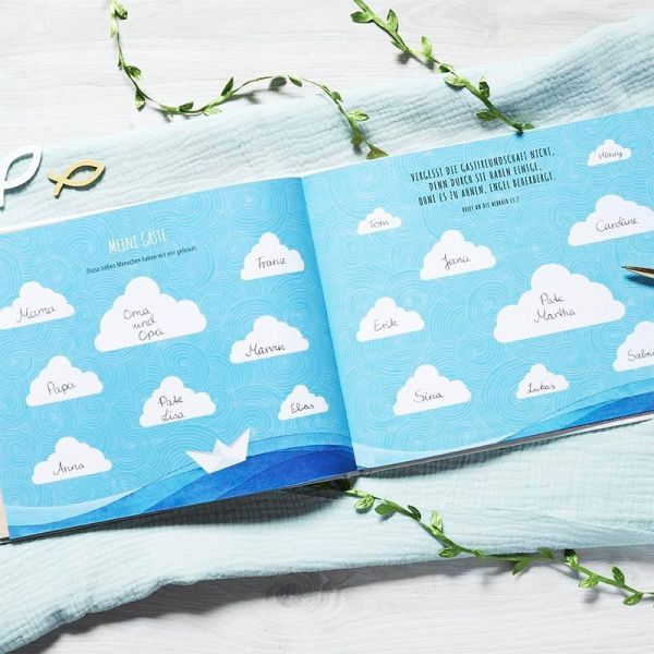 Das liebevoll gestaltete Album bietet viel Platz, um die besonderen Erinnerungen an die Erstkommunion festzuhalten: Fotos, Einladungskarten, kirchliche Festtagsdokumente und andere Erinnerungsstücke können eingeklebt werden.