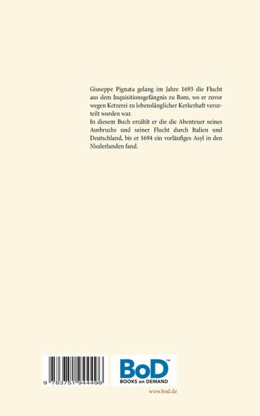 Giuseppe Pignata gelang im Jahre 1693 die Flucht aus dem Inquisitionsgefängnis zu Rom, wo er zuvor wegen Ketzerei zu lebenslänglicher Kerkerhaft verurteilt worden war. In diesem Buch erzählt er die die Abenteuer seines Ausbruchs und seiner Flucht durch Italien und Deutschland, bis er 1694 ein vorläufiges Asyl in den Niederlanden fand.