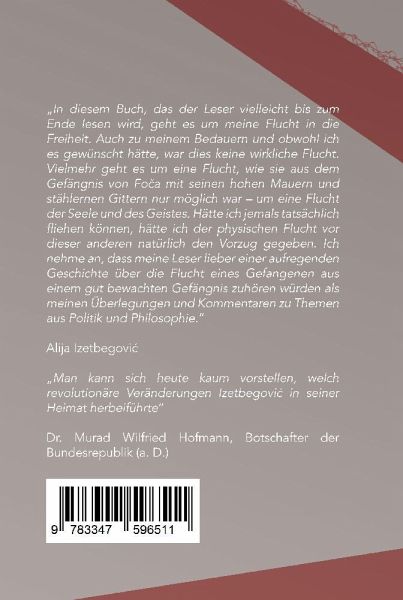 "In diesem Buch, das der Leser vielleicht bis zum Ende lesen wird, geht es um meine Flucht in die Freiheit. Auch zu meinem Bedauern und obwohl ich es gewünscht hätte, war dies keine wirkliche Flucht. Vielmehr geht es um eine Flucht, wie sie aus dem Gefängnis von Foca mit seinen hohen Mauern und stählernen Gittern nur möglich war - um eine Flucht der Seele und des Geistes. Hätte ich jemals tatsächlich fliehen können, hätte ich der physischen Flucht vor dieser anderen natürlich den Vorzug gegeben. Ich nehme an, dass meine Leser lieber einer aufregenden Geschichte über die Flucht eines Gefangenen aus einem gut bewachten Gefängnis zuhören würden als meinen Überlegungen und Kommentaren zu Themen aus Politik und Philosophie."Alija Izetbegovic