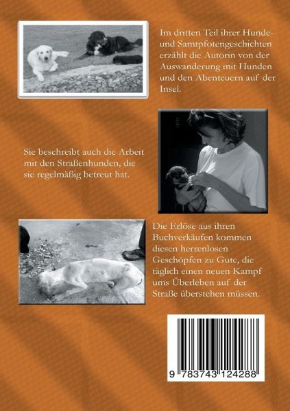 Im dritten Teil ihrer Hunde- und Samtpfotengeschichten erzählt die Autorin von der Auswanderung mit Hunden und den Abenteuern auf der Insel. Sie beschreibt auch die Arbeit mit den Straßenhunden, die sie regelmäßig betreut hat.Die Erlöse aus ihren Buchverkäufen kommen diesen herrenlosen Geschöpfen zugute, die täglich einen neuen Kampf ums Überleben auf der Straße überstehen müssen.
