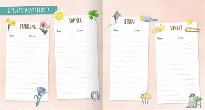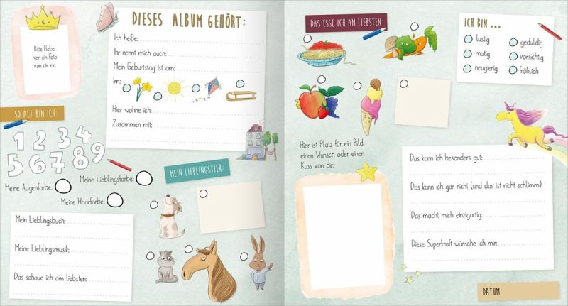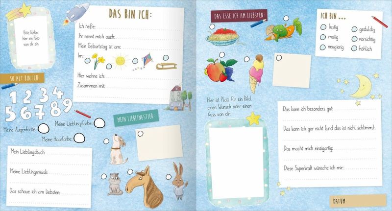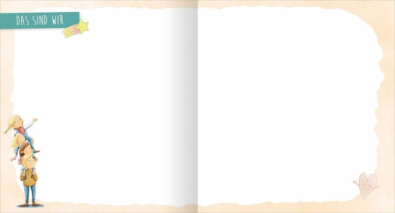 Auf je einer Doppelseite kann jedes Kind einfache Fragen beantworten, die Augen- und Haarfarbe ankreuzen und ein kleines Kunstwerk malen oder sich dabei helfen lassen. So werden die Einträge zu persönlichen Erinnerungen an alle deine Freundinnen und Freunde.