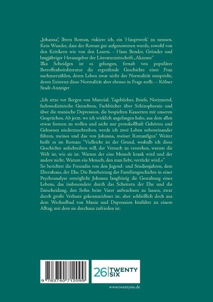 lka Scheidgen zeigt auch in diesem Buch, wie einfühlsam sie einschneidende Ereignisse literarisch zu verarbeiten im Stande ist. Es handelt sich um einen Roman, der Mut macht und einen Beitrag zum Verständnis und Erkennen dieser nicht leicht fassbaren Krankheit liefert. Den wechselvollen Wegen in dieser Lebensbeschreibung zu folgen, liest sich sehr spannend. Erzählt wird von den Jugend- und Studienjahren, dem Elternhaus, der Ehe. Die Bearbeitung der Familiengeschichte in einer Psychoanalyse ermöglicht Johanna langfristig die Gestaltung eines Lebens, das zwar durch große Verluste gekennzeichnet ist, aber schließlich doch aus dem Wechselbad von Manie und Depression hinführt zu einem Alltag, mit dem sie durchaus zufrieden ist.Es ist zudem ein inhaltlich dichtes und literarisch überzeugendes Buch über eine lebenslange Freundschaft: "Vielleicht ist der Grund, weshalb ich diese Geschichte aufschreiben will, der Versuch zu verstehen, warum die Welt ist, wie sie ist. Warum der eine Mensch krank wird und der andere nicht. Warum ein Mensch, den man liebt, verrückt wird."Was dem Text darüber hinaus Tiefe verleiht: Das Leben von Johanna spiegelt - von der Krankheit abgesehen - typische Generationsmuster wider: die Dominanz des Vaters, die Unterordnung der Mutter, die Flucht in die Ehe. Das sind biografische Erfahrungen, die viele Frauen teilen."llka Scheidgen ist mit 'Meine Freundin Johanna' ein Roman gelungen, der sich mit einem komplizierten und in der Gesellschaft leider immer noch tabuisierten Krankheitsbild auf spannende Weise auseinandersetzt. Der aufklärt, ohne zu verurteilen. Erinnert, ohne zu beschönigen. Es wäre viel, wenn durch die stilistische Bandbreite dieser Annäherung Fernstehenden wie Betroffenen ein verständiger Zugang zu dem ermöglicht werden könnte, was Johanna leiden macht. So unerklärlich es auch sein mag. Auf diesen Seiten des Lebens." Die Tagespost"Der Text ist ein eindrückliches Erlebnis einer irrealen Welt, die auch das Elend der Psychiatrie in der Zeit nach dem Zweiten Weltkrieg widerspiegelt." Ärzte-Zeitung"Ilka Scheidgen ist es gelungen, fernab von populärer Betroffenheitsliteratur die ergreifende Geschichte einer Frau nachzuerzählen, deren Leben zwar nicht der Normalität entspricht, deren Existenz diese Normalität aber ebenso in Frage stellt." Kölner Stadt-Anzeiger"Johanna", Ihren Roman, riskiere ich, ein 'Hauptwerk' zu nennen. Hans Bender, langjähriger Herausgeber der Literaturzeitschrift 'Akzente'