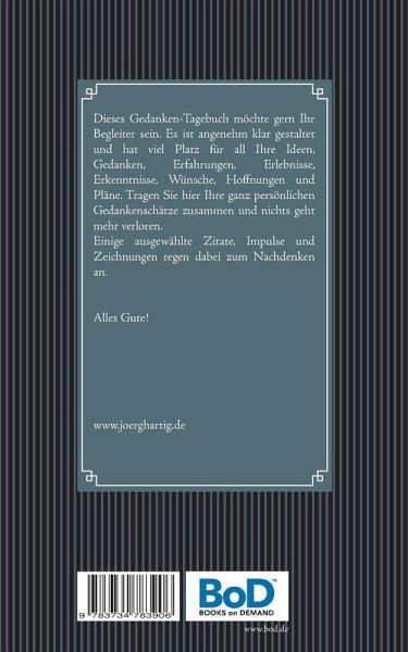 Dieses Gedanken-Tagebuch möchte gern Ihr Begleiter sein. Es ist angenehm klar gestaltet und hat viel Platz für all Ihre Ideen, Gedanken, Erfahrungen, Erlebnisse, Erkenntnisse, Wünsche, Hoffnungen und Pläne. Tragen Sie hier Ihre ganz persönlichen Gedankenschätze zusammen und nichts geht mehr verloren. "Meine Gedanken" ist gibt es als gebundene Ausgabe mit Lesebändchen und als Paperback. - 112 cremefarbene Seiten, dezent grau liniert - im Format: 14 x 22 cm (ca. A5)- mit ausgewählten Zitaten - mit 2 Zeichnungen und Impulsgedanken des Autors zum Thema Selbstentwicklung Das Gedanken-Tagebuch ist empfehlenswert für alle Tagebuchliebhaber/innen sowie als inspirierendes Begleitbuch für Coaching, Beratung, usw.