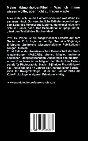 Meine Hämorrhoidenfibel - was ich immer wissen wollte, aber nie zu fragen wagteAlles dreht sich um die Hämorrhoiden und was damit zusammen hängt. Gut verständliche Erläuterungen bringen dem Leser die komplizierte Materie, manchmal mit einem Schuss Humor, näher. Das Bildmaterial ist üppig und ergänzt den Textteil des Buches ideal.