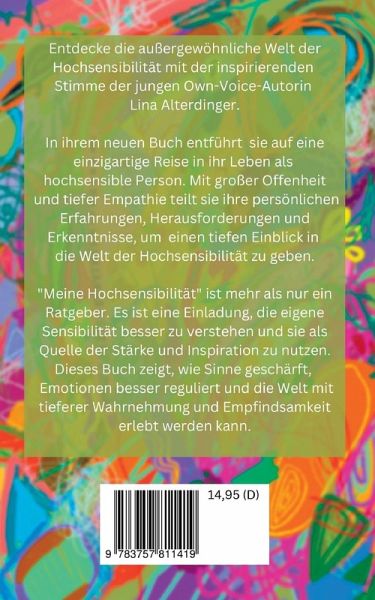 im Juli 2023 kehrt der BoD Bestseller-Titel "Meine Hochsensibiliätät - Hochsensibilität richtig nutzen und als Gabe erkennen" von Lina Alterdinger als optimierte Neuauflage mit strahlendem neuen Cover, tiefergehenden Inhalt, verbesserter Qualität und einem exklusiven Vorwort der Bestsellerautorin Mimi zurück. Entdecke die außergewöhnliche Welt der Hochsensibilität mit der inspirierenden Stimme der jungen own-voice-Autorin Lina Alterdinger. In ihrem neuen Buch entführt sie auf eine einzigartige Reise in ihr Leben als hochsensible Person. Mit großer Offenheit und tiefer Empathie teilt sie ihre persönlichen Erfahrungen, Herausforderungen und Erkenntnisse, um einen tiefen Einblick in die Welt der Hochsensibilität zu geben. "Meine Hochsensibilität"ist mehr als nur ein Ratgeber. Es ist eine Einladung, die eigene Hochsensibilität besser zu verstehen und sie Quelle der Stärke und Inspiration zu nutzen. Dieses Buch zeigt, wie Sinne geschärft, Emotionen besser reguliert, und die Welt mit tieferer Wahrnehmung und Empfindsamkeit erlebt werden kann.