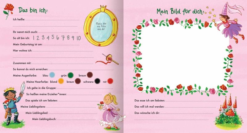 Bei diesem Freundschaftsbuch können sogar schon die Jüngsten im Kindergarten mitmachen. Auf je einer Doppelseite kann jedes Kind einfache Fragen beantworten, die Augen- und Haarfarbe ankreuzen und ein kleines Kunstwerk malen. Das handliche Format passt in jede Kindergartentasche und dank des robusten und abwischbaren Materials hält das Album viele Kindergartenjahre lang.