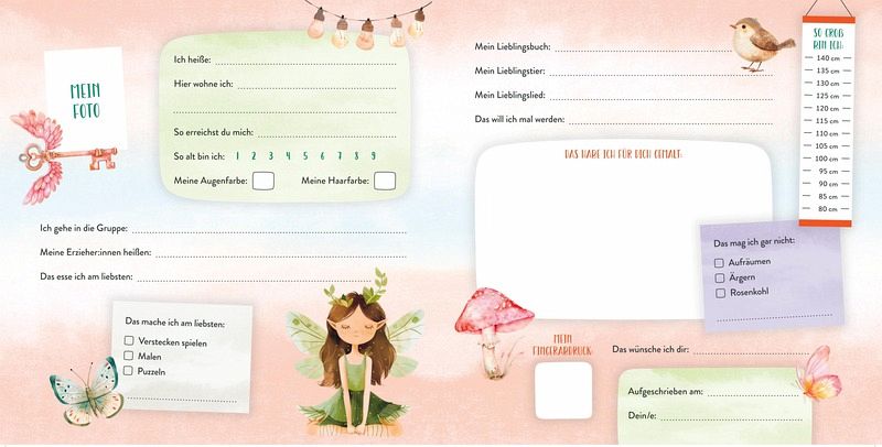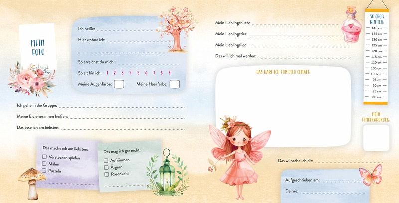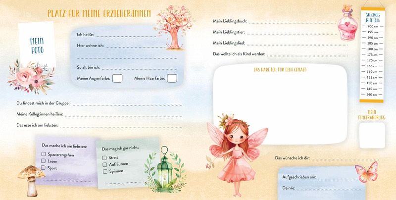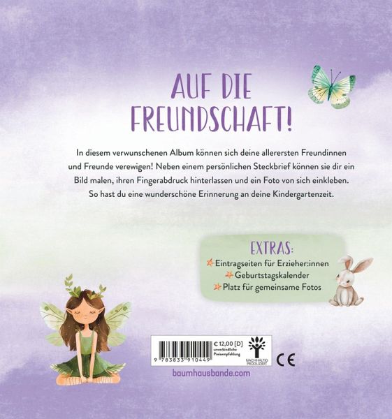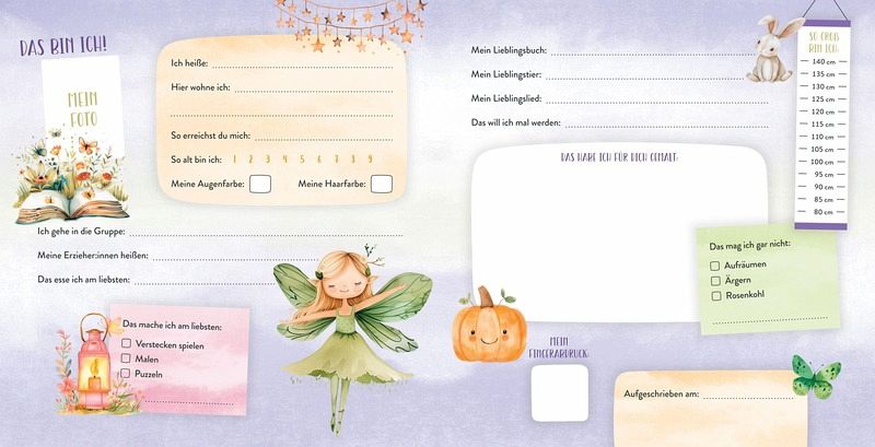 In diesem zauberhaften Album im Aquarellstil können sich die ersten Sandkastenfreund:innen zwischen Waldfeen, Schmetterlingen und Blumen verewigen. Sie verraten zum Beispiel, was ihr Lieblingsessen ist und welches Buch sie gerade am liebsten lesen. Neben dem persönlichen Steckbrief gibt es natürlich auch Platz für kleine Kunstwerke und ein eingeklebtes Foto. Außerdem finden sich im Buch Extraseiten für Erzieher:innen, Geburtstage und gemeinsame Fotos. So wird dieses Freundebuch zu einem wertvollen Erinnerungsschatz.